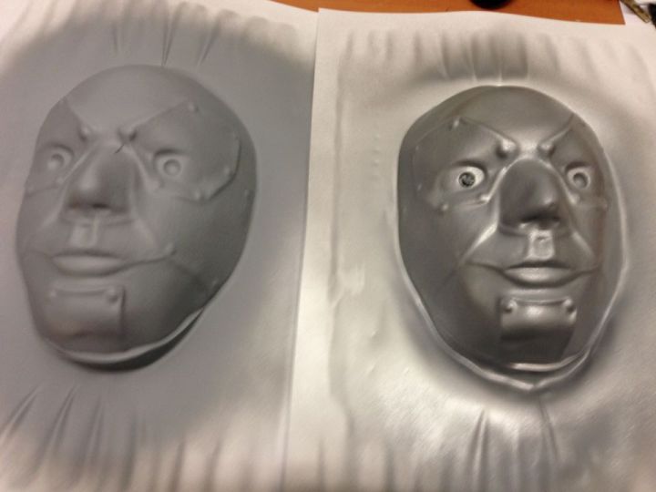 Kunstoff Umformen - TiefziehenHier ein beispiel einer Maske. Tiefgezogen mit einer 0,5mm Folie und nacher lackiert. Weitere Anwendungsmöglichkeiten: -Schokoladen Gussformen -Seifen Gussformen -Blister-Verpackungen -Modell-Auto Karosserie